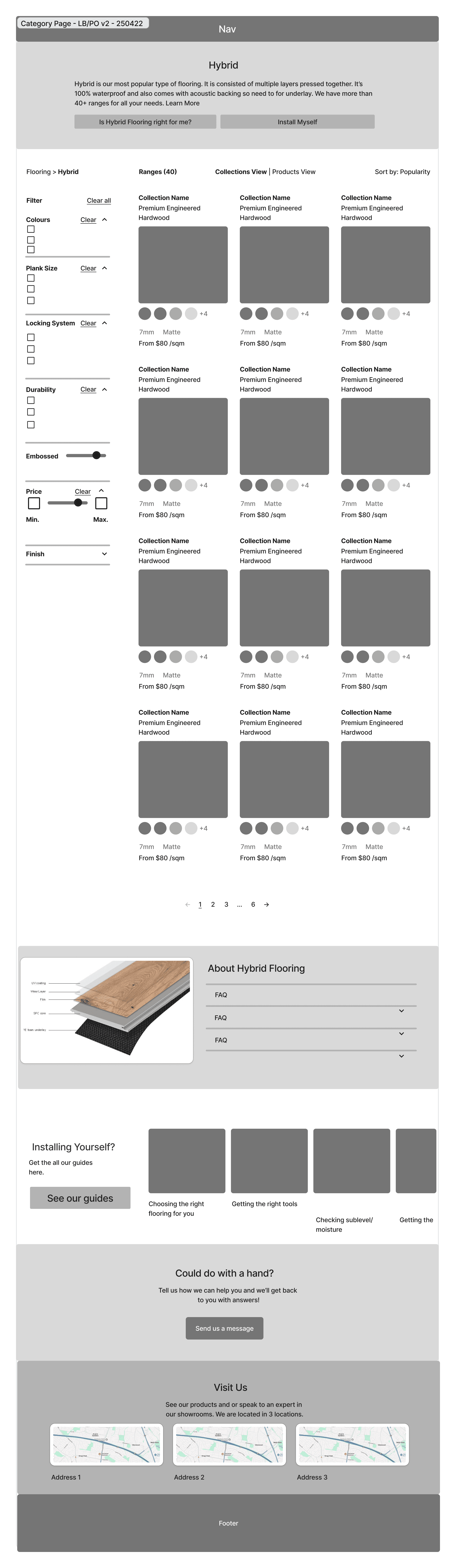 Product Category pages most commonly display products in a paginated gallery with product filtering and sorting capabilities. This was a far cry from where FloorVenue was starting. Its product category pages displayed a full-width block for each product collection (i.e. product and its variants). Without pagination, this page scrolled seemingly endlessly through the tens of product collections.