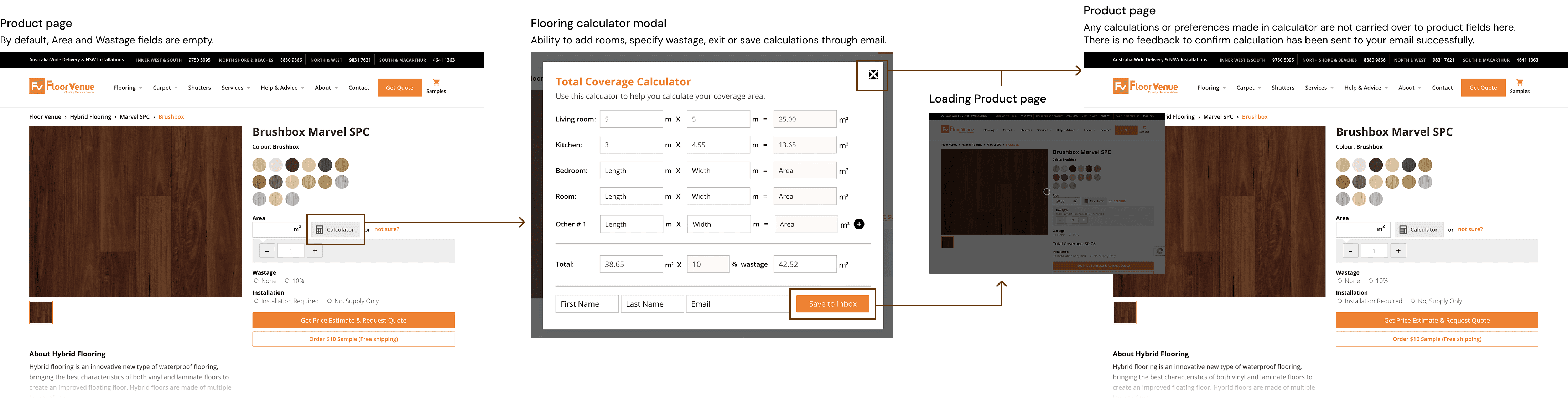 Automatically carrying over entered values across product pages, reducing repetition and preventing user error during checkout – including total calculated area and desired wastage (the % of extra flooring ordered to cater for material that is cut and discarded in the installation process).